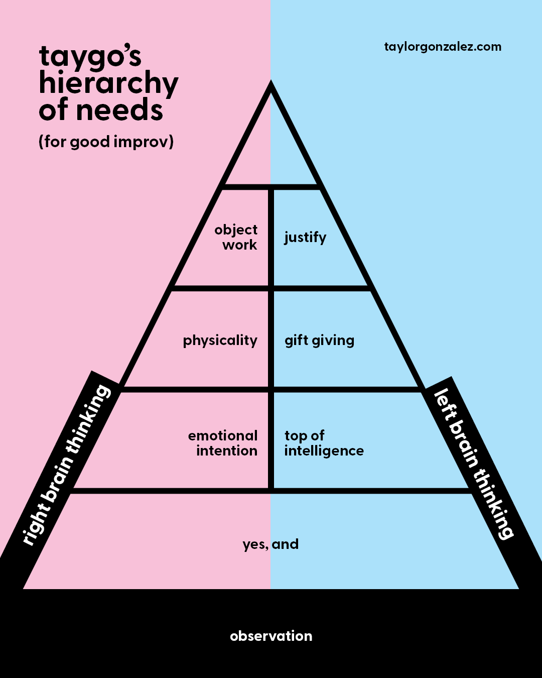 After studying and teaching improv for many years, I became more and more infatuated with the idea that a typical improv scene has prioritized “needs” not unlike the concept of Maslow’s Hierarchy of Needs. This template helped me organize the most basic (and important) “tools” on our “tool belt” when doing improv. These building blocks not only make scenes better and more fun, but they also make improv much easier for the players involved.